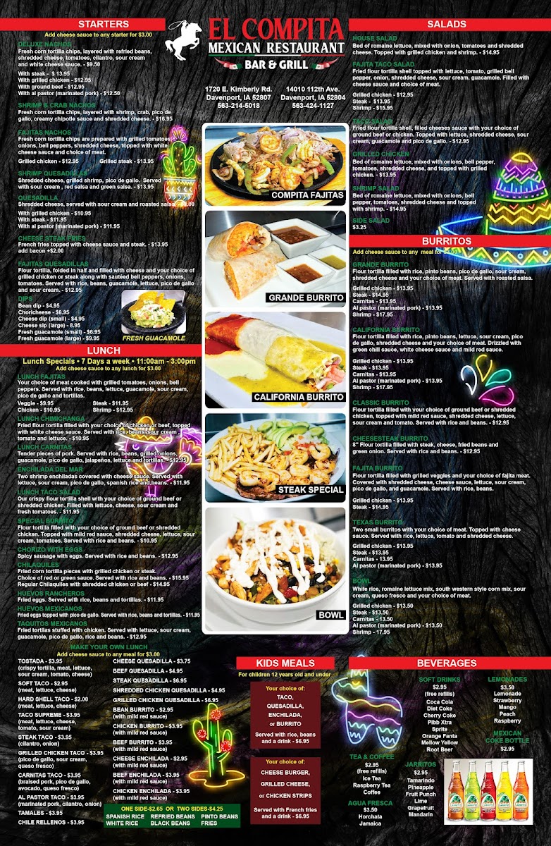 Welcome to El Compita Mexican Restaurant Bar and Grill, located at 1720 E Kimberly Rd, Davenport, IA. This vibrant eatery embodies the heart of traditional Mexican cuisine, offering a delightful menu that transports your taste buds straight to Mexico.